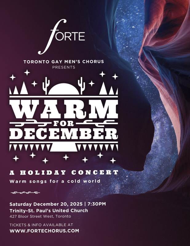Forte – Toronto’s gay men’s chorus – turns up the heat with Warm for December, a choral concert that wraps you in queer joy, holiday feels, and maybe a touch of desert sun.