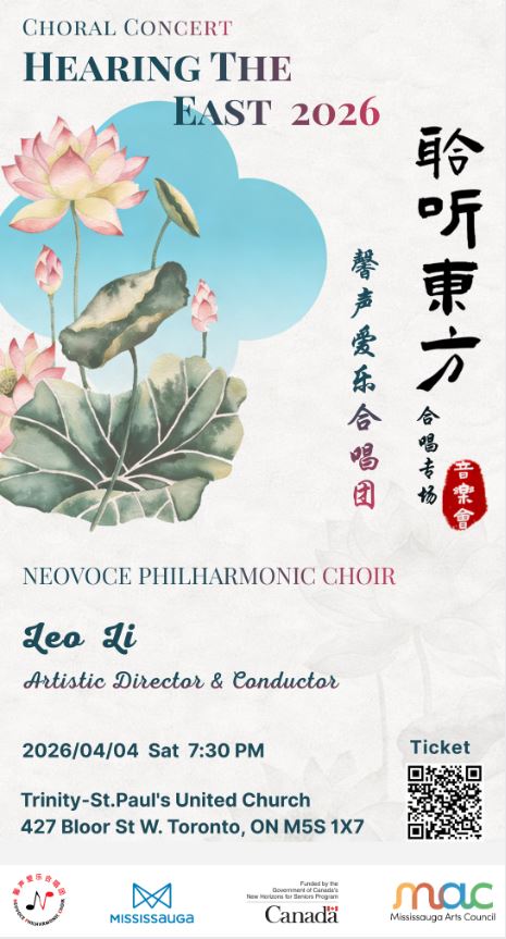 The NeoVoce Philharmonic Choir proudly presents its annual grand concert Hearing the East 2026, taking place on April 4, 2026 at the renowned Trinity-St. Paul’s United Church in Toronto.